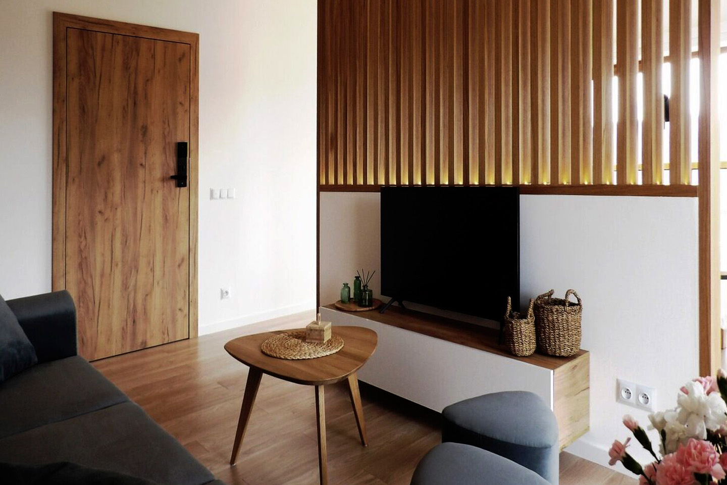 Salon został wyposażony w duży telewizor, wygodną sofę, pufy oraz fotele i krzesła a także stoliki, przy których delektować się można smakiem porannej kawy, czy też miło spędzać czas wieczorami.