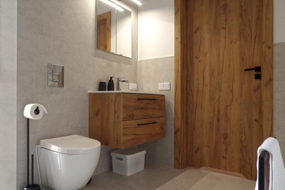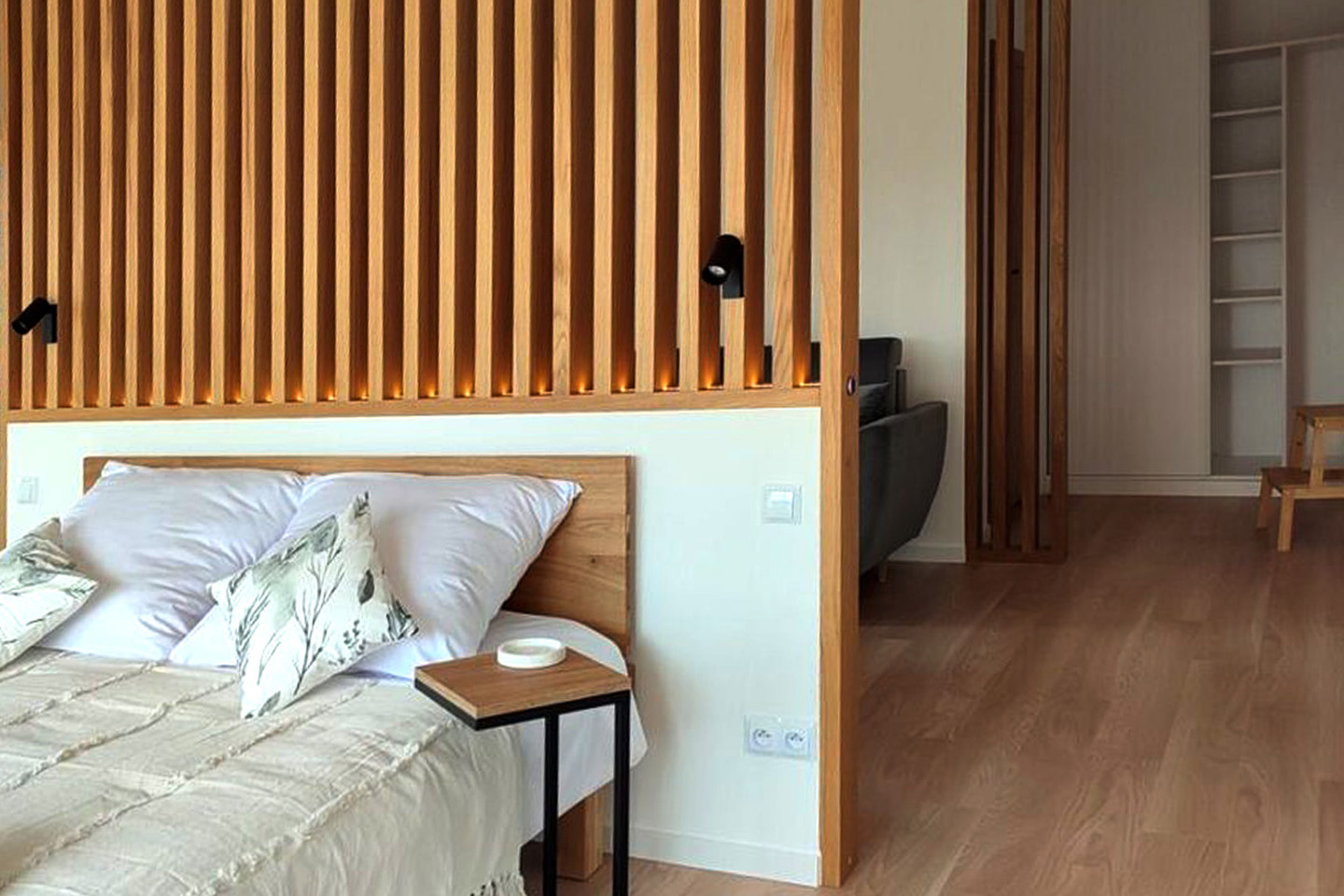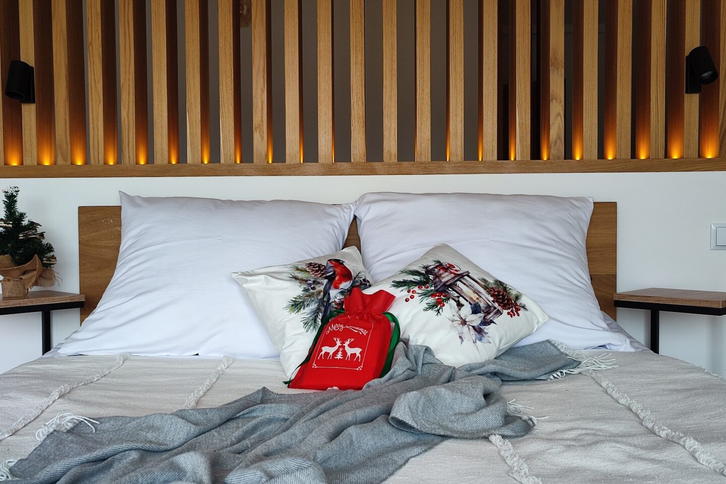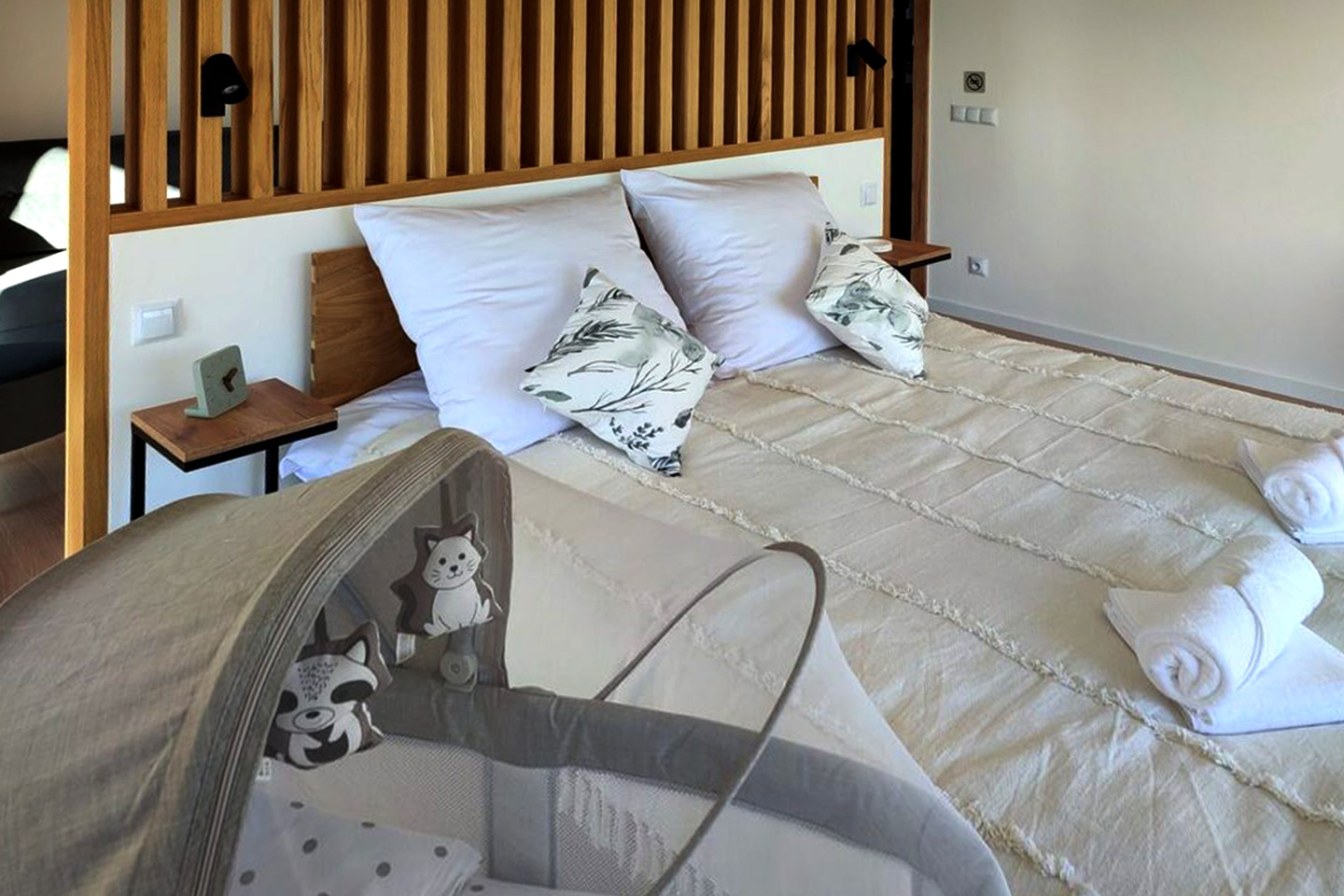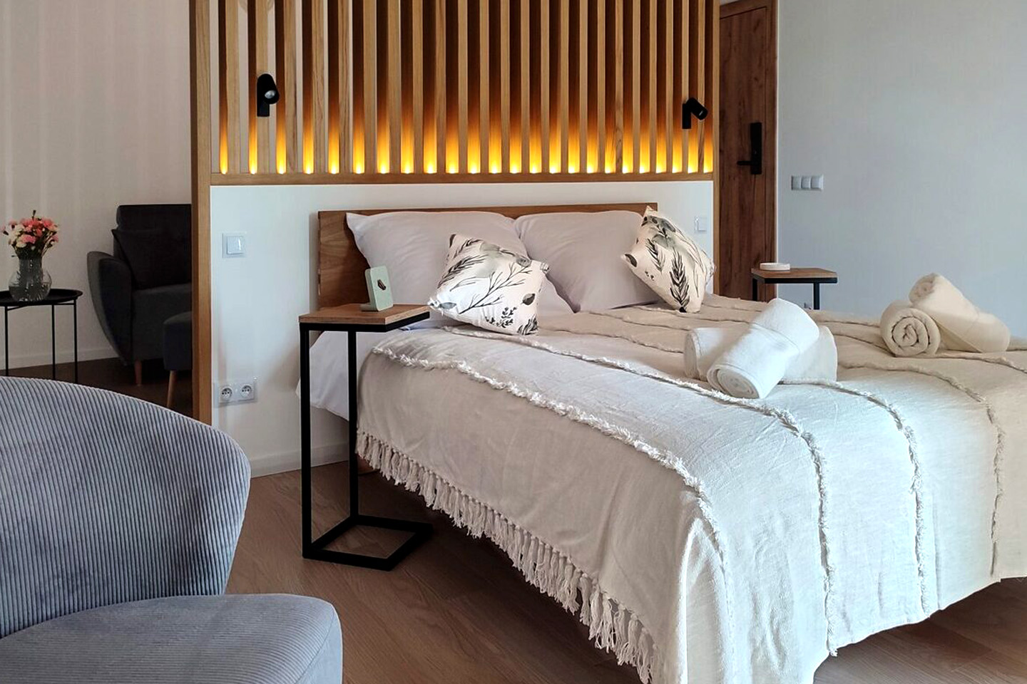 Apartamenty składają się z części sypialnej, wypoczynkowej z wygodną sofą lub fotelami i płaskim telewizorem, części biurowej, przestronną łazienką z prysznicem oraz prywatnym balkonem, z którego podziwiać można panoramę Jeziora Czorsztyńskiego oraz pasm górskich: Pienin, Gorców oraz Tatr. Na 1 piętrze znajdują się trzy Apartamenty oraz kuchnia wspólna z wyspą śniadaniową.