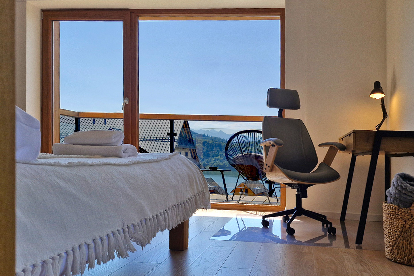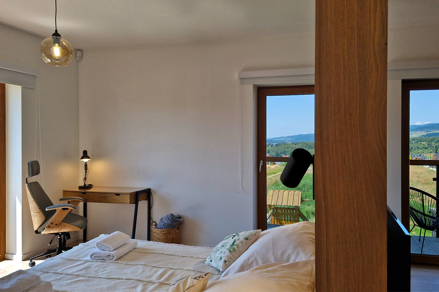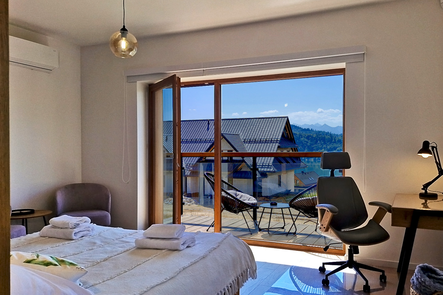 Dla naszych Gości przygotowaliśmy dodatkowo wspólną dla wszystkich część wypoczynkową – salon widokowy. Przeznaczyliśmy dla niego atrakcyjną, przestronną przestrzeń poddasza z panoramicznym oknem oraz balkonem skierowanym na południe. Podziwiać z niego można wschody i zachody słońca oraz widoki na pobliskie pasma górskie oraz jezioro.