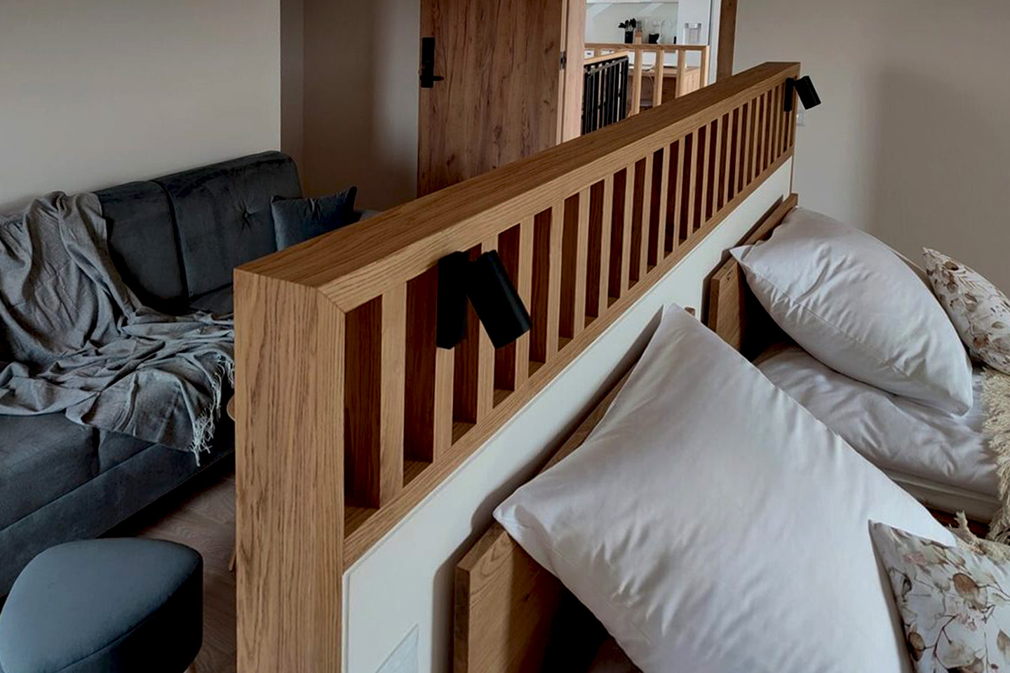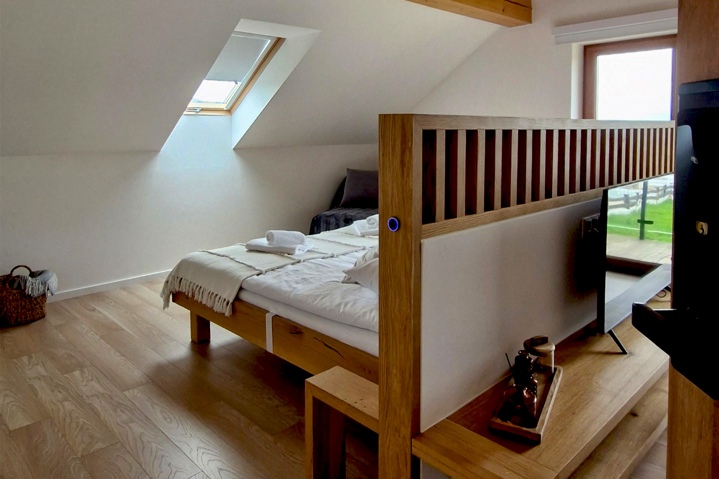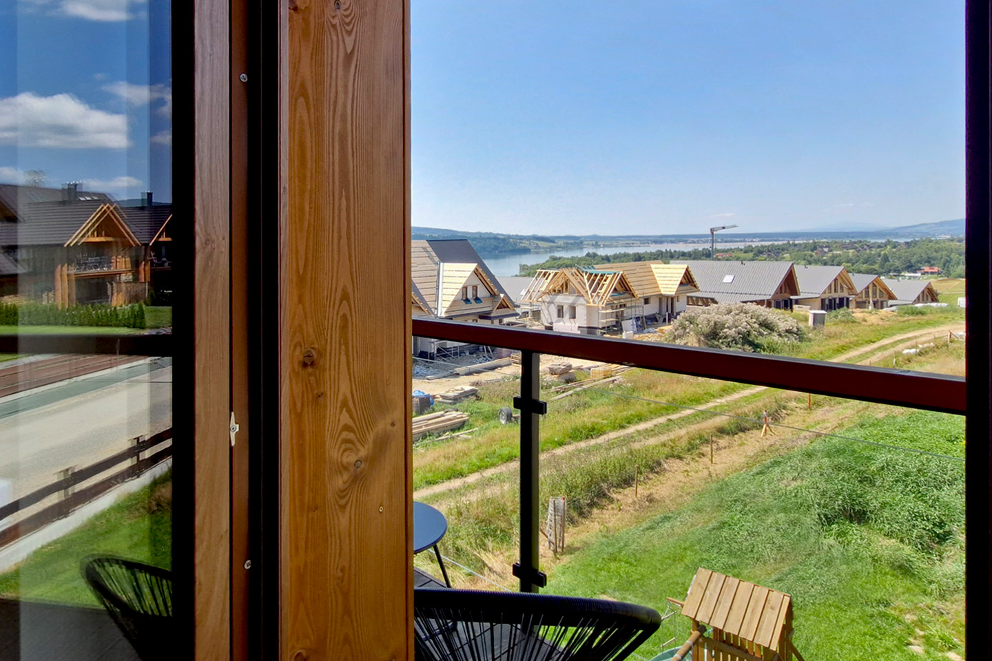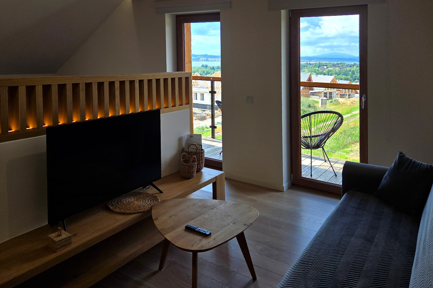 Dla naszych Gości przygotowaliśmy dodatkowo wspólną dla wszystkich część wypoczynkową – salon widokowy. Przeznaczyliśmy dla niego atrakcyjną, przestronną przestrzeń poddasza z panoramicznym oknem oraz balkonem skierowanym na południe. Podziwiać z niego można wschody i zachody słońca oraz widoki na pobliskie pasma górskie oraz jezioro.
