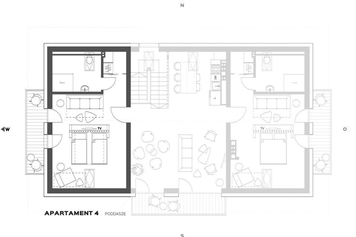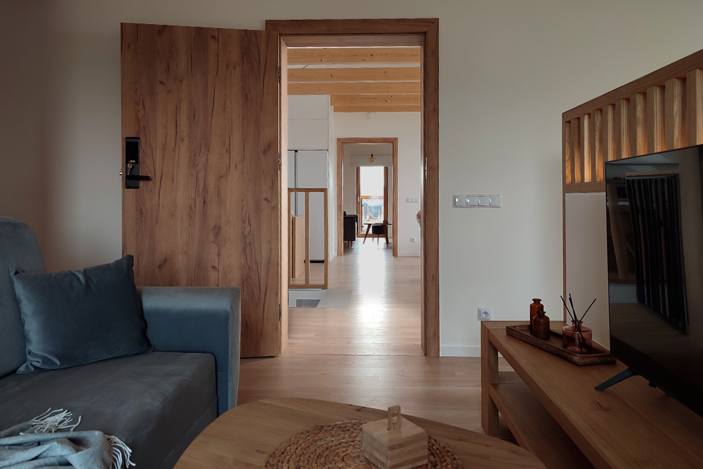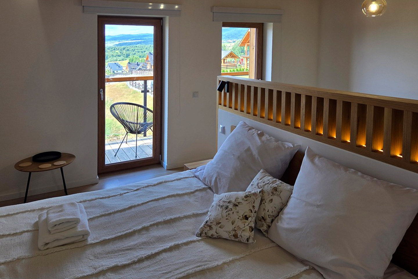 Apartamenty składają się z części sypialnej, wypoczynkowej z wygodną sofą lub fotelami i płaskim telewizorem, przestronną łazienką z prysznicem oraz prywatnym balkonem, z którego podziwiać można panoramę Jeziora Czorsztyńskiego oraz pasm górskich: Pienin, Gorców oraz Tatr. Na poddaszu znajdują się dwa Apartamenty, wspólna kuchnia z wyspą śniadaniową oraz wspólny, przestronny salon widokowym dla Gości ze wszystkich Apartamentów.