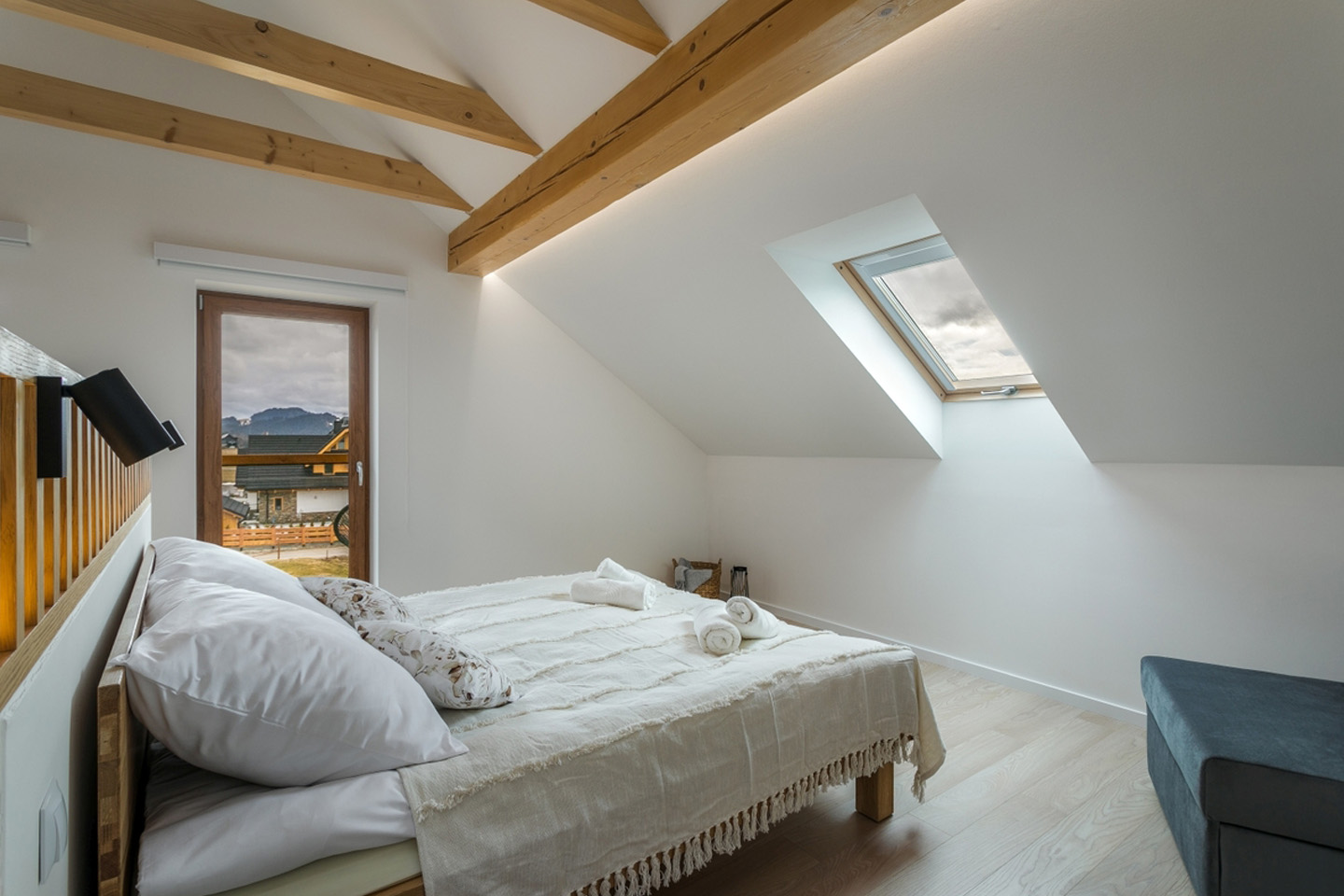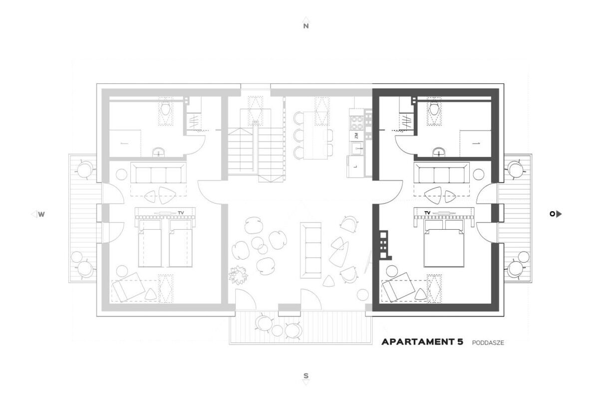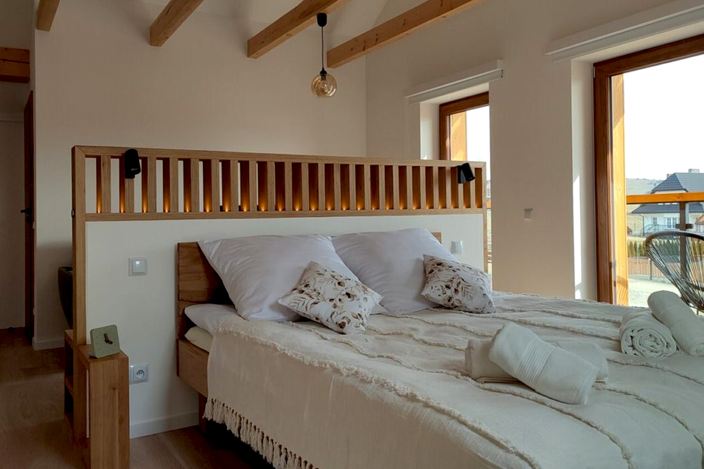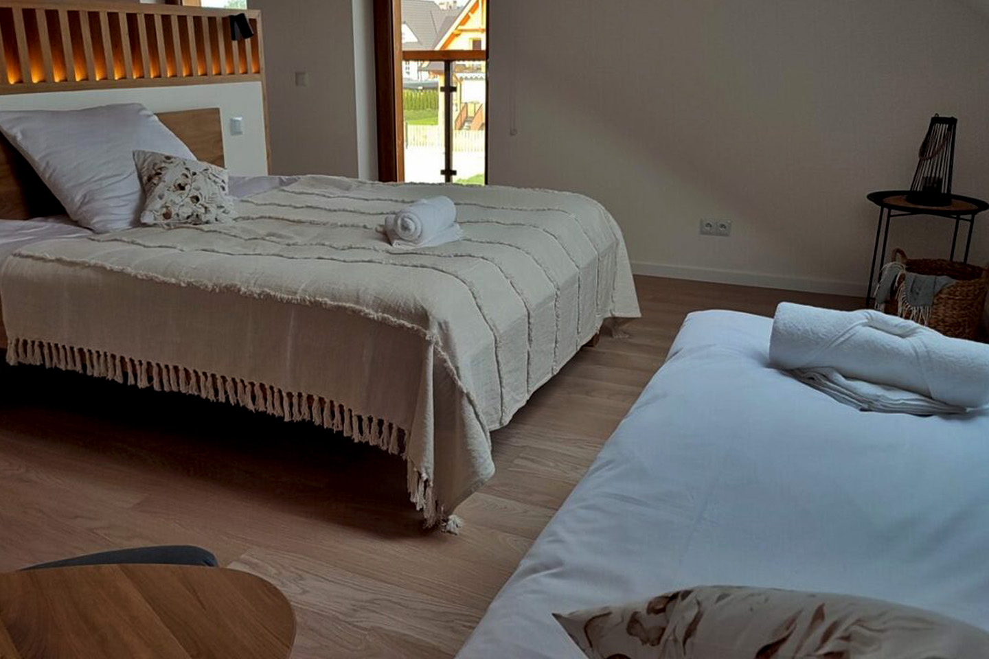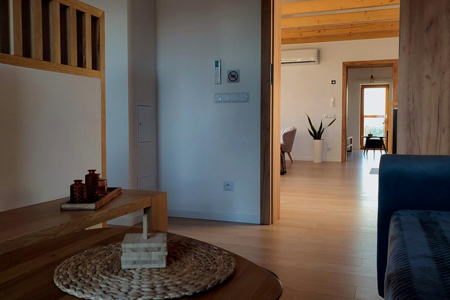 Apartamenty składają się z części sypialnej, wypoczynkowej z wygodną sofą lub fotelami i płaskim telewizorem, przestronną łazienką z prysznicem oraz prywatnym balkonem, z którego podziwiać można panoramę Jeziora Czorsztyńskiego oraz pasm górskich: Pienin, Gorców oraz Tatr. Na poddaszu znajdują się dwa Apartamenty, wspólna kuchnia z wyspą śniadaniową oraz wspólny, przestronny salon widokowym dla Gości ze wszystkich Apartamentów.