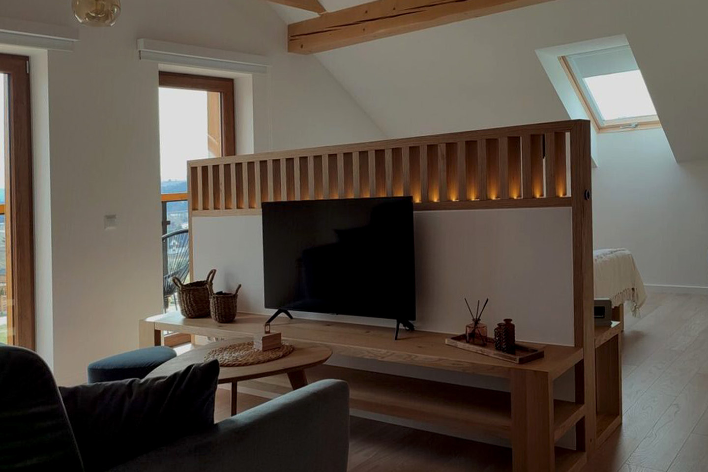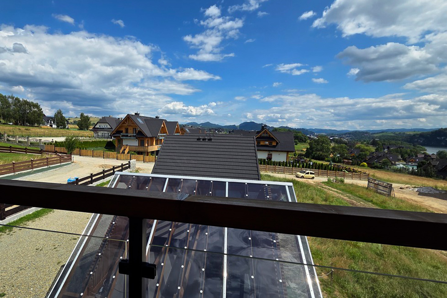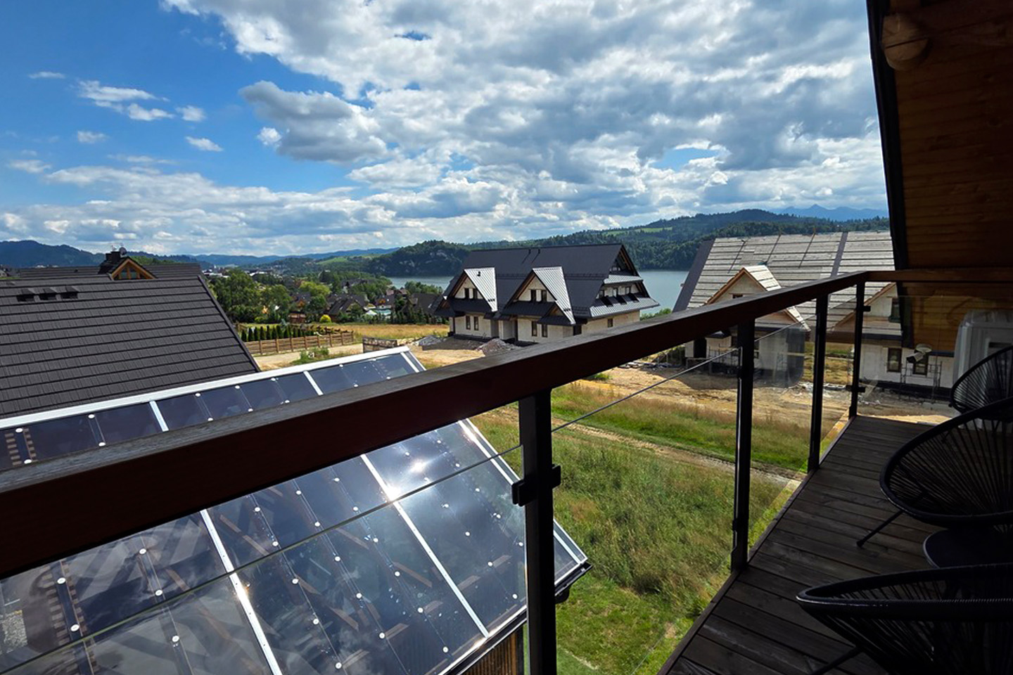 Dla naszych Gości przygotowaliśmy dodatkowo wspólną dla wszystkich część wypoczynkową – salon widokowy. Przeznaczyliśmy dla niego atrakcyjną, przestronną przestrzeń poddasza z panoramicznym oknem oraz balkonem skierowanym na południe. Podziwiać z niego można wschody i zachody słońca oraz widoki na pobliskie pasma górskie oraz jezioro.