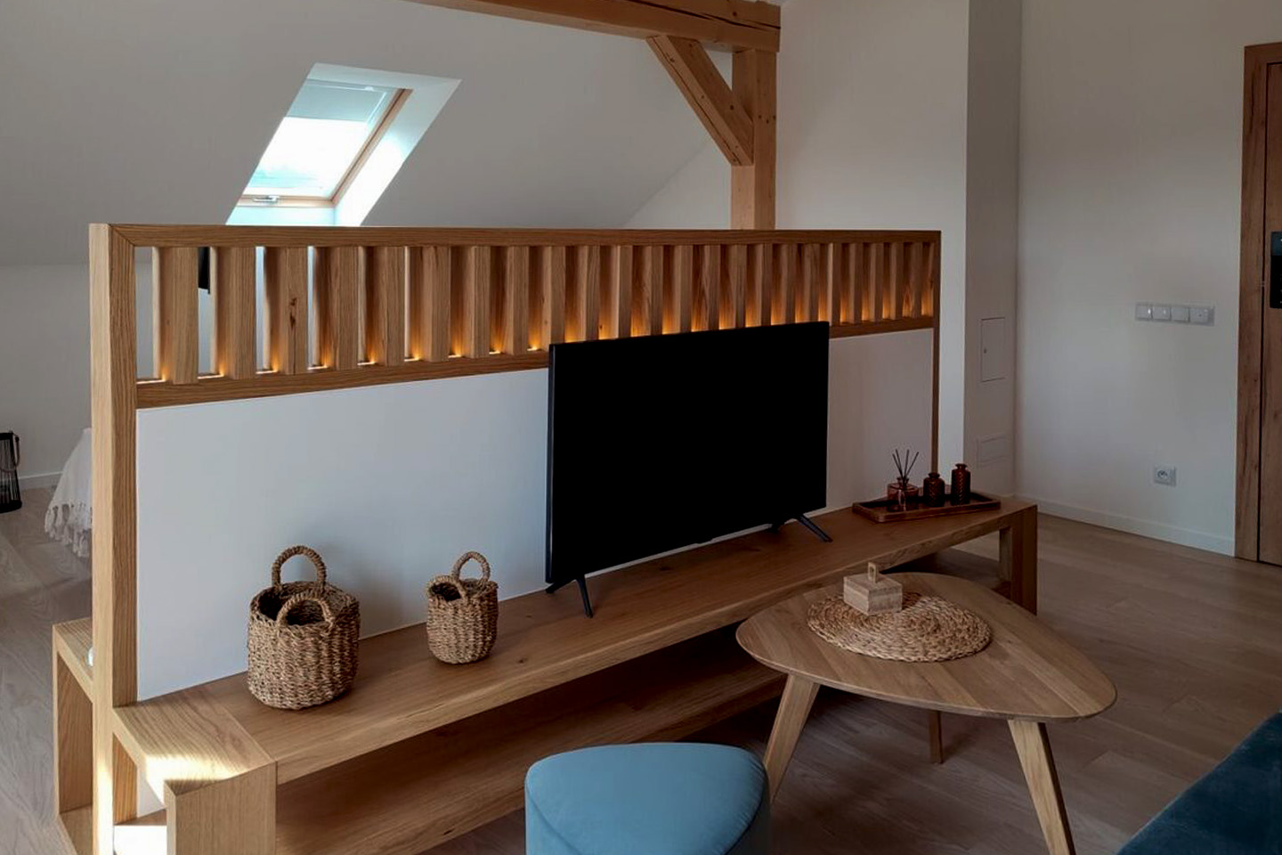 Salon został wyposażony w duży telewizor, wygodną sofę, pufy oraz fotele i krzesła a także stoliki, przy których delektować się można smakiem porannej kawy, czy też miło spędzać czas wieczorami.